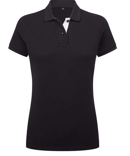 Fitted polo for women with contrast collar and placket. Two contrast coloured buttons on placket. Contrast colour on side vents. Twin needle stitching on hem. Ribbed knit collar and sleeve cuffs.