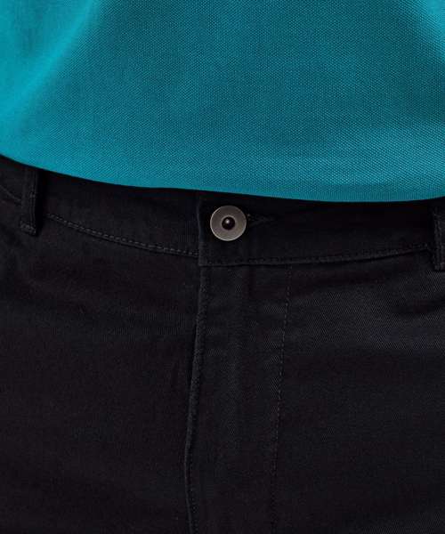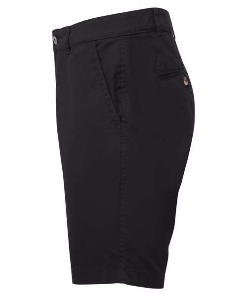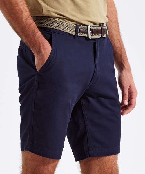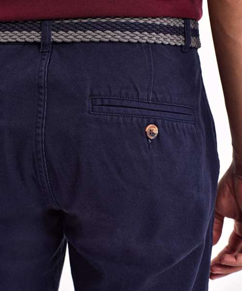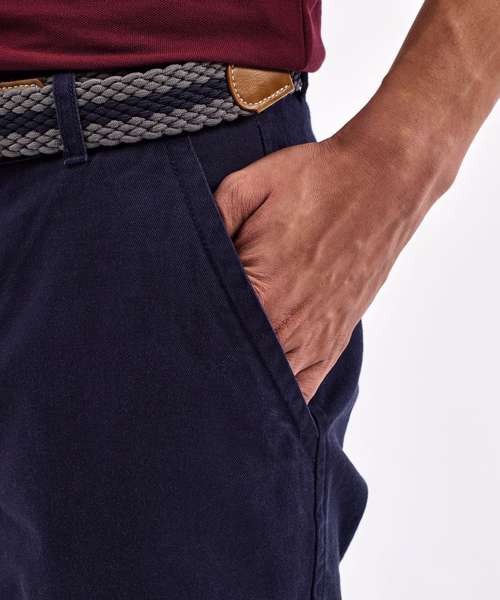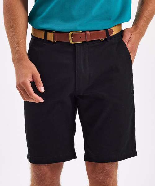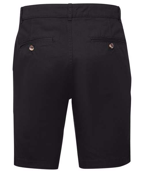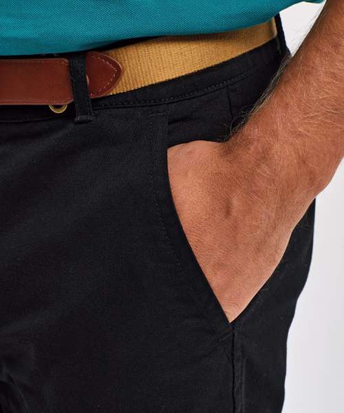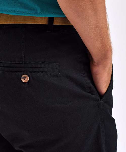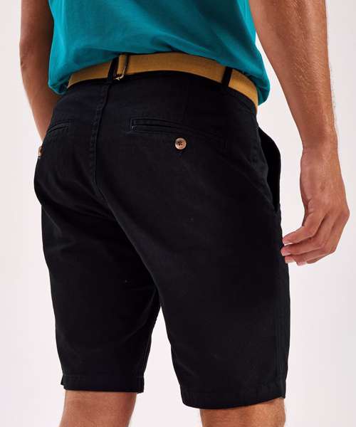 Men's chino shorts with two swings pockets and two back jet pockets with button fastening. Zip fly and button fastening to the front. Soft finish fabric.