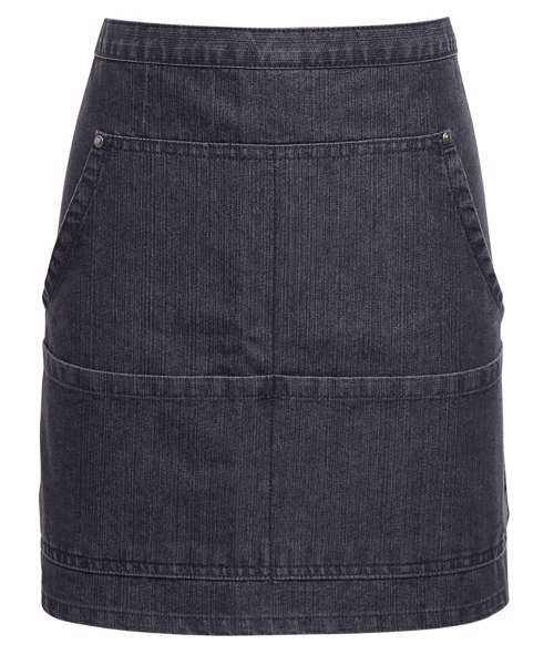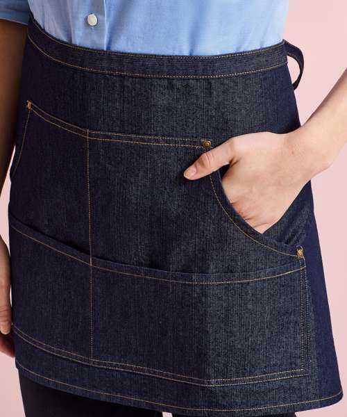 We have combined practicality with style and are proud to present this trendy denim waist apron that is a welcome addition to the hospitality wear collection. A popular cropped style featuring contrast stitch detail that forms four front pockets which are handy for carrying payment terminals and order pads. Self-fabric ties are long enough to be doubled and tied at the front completing a neat and professional uniform for service staff.