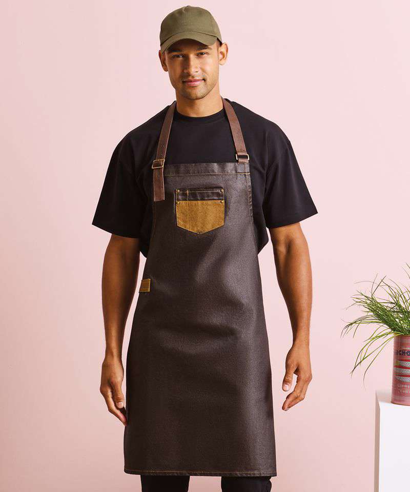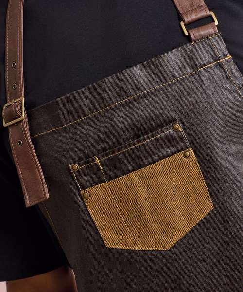 A bib apron with rustic charm for those who want a more vintage approach to their service uniforms. Decorated with contrast fabric features for design and functionality. The faux leather detail really elevates this apron to give it an authentic, luxurious appearance, popular with many establishments.