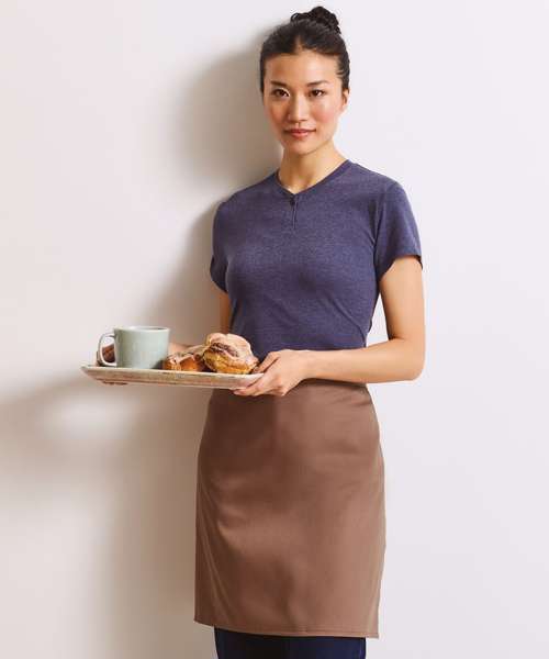 A mid-length waist apron available in 36 colours from the Premier 'Colours Collection' where the customer is guaranteed an exact pantone match across the range. A coloured apron that has ties long enough to double around the front.