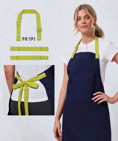 Apron body with straps sold separately for ultimate customisation (for body, see PR190). Mix and match colours, without the need for a bespoke option. Simply choose your apron body, then select contrasting neckband and waist ties available here. Straps fasten securely to this apron body using strong, self-coloured, snap-action press studs. Centre pocket with combined pen pocket. Self-fabric cloth holder. Contains certified recycled polyester.