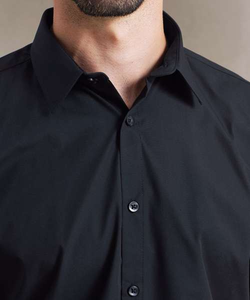 Supreme heavier weight poplin shirt with improved wear and appearance. Stiffened formal cut collar. Two button fastening detail on collar stand. Semi fitted styling. Easy cut-out label for rebranding. Easycare.