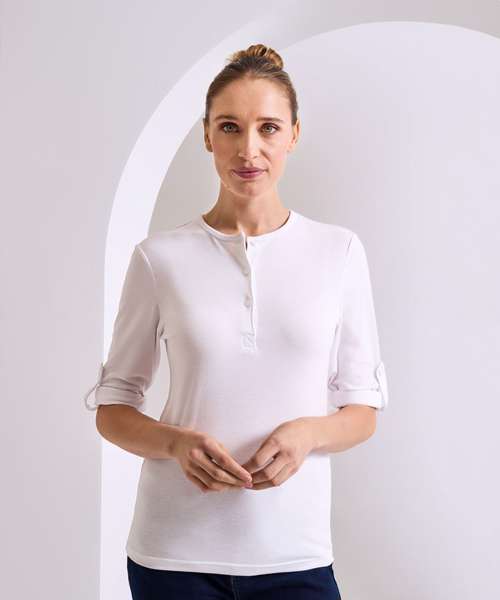 Take on a modern utilitarian trend with this women's roll sleeve tee. A simple but versatile style that can be worn as a long sleeve or rolled back and fastened in place on the upper arm. Soft to touch with an element of stretch in the fabric, this is a trendy piece of workwear that acts as casual alternative to a shirt.