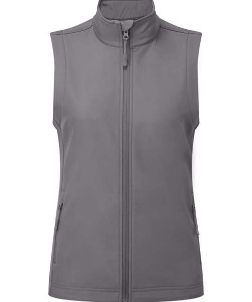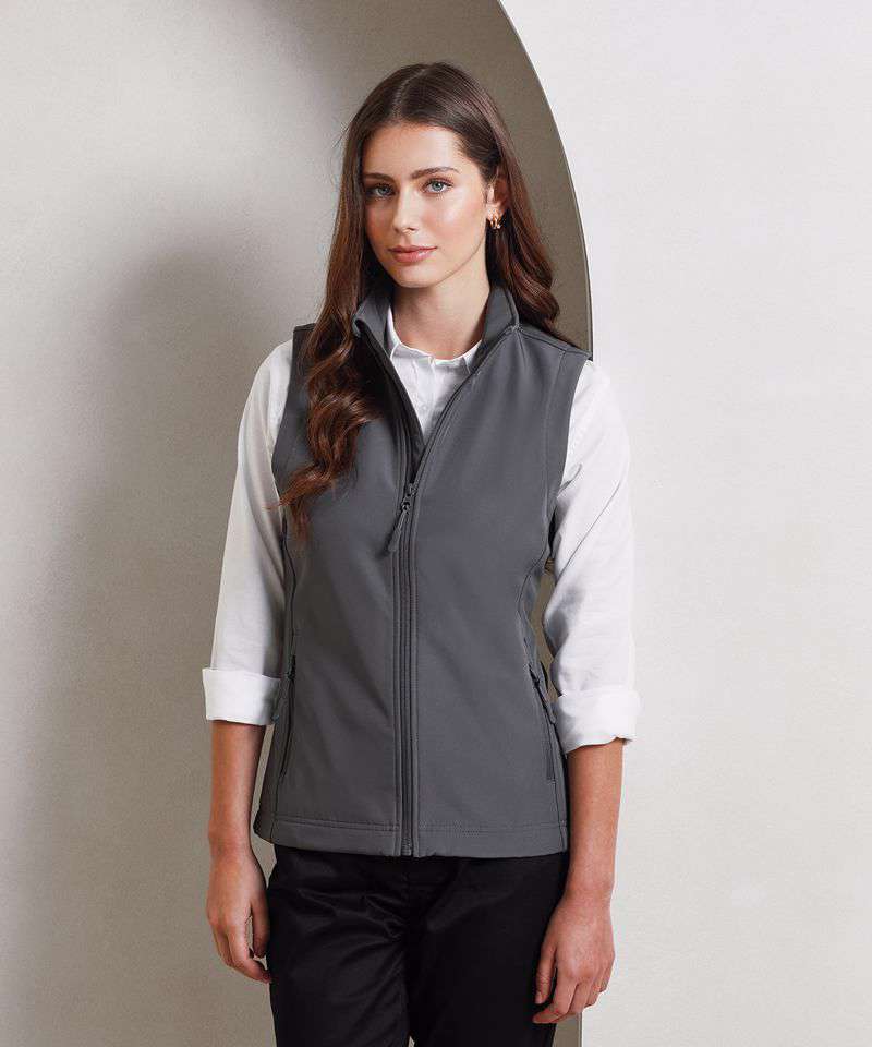 A women’s two-layer softshell gilet carrying Premier’s Windchecker®️ trademark for wind and water resistance through the fabric. Made with certified 100% recycled polyester with n bonded fleece inner layer, this zip-through softshell bodywarmer features handy zipped side pockets and an elasticated drawcord hem for fit. A great versatile outer layer for casual and corporate dressing, featuring a curved hem and stitched side panels for a more feminine fit.