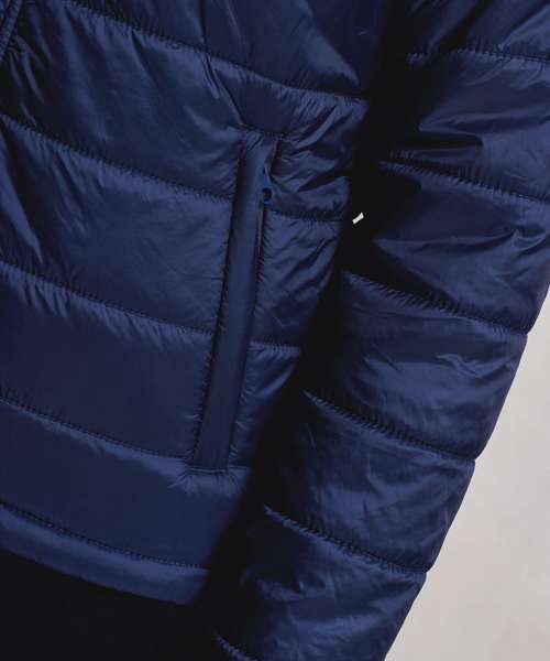 Women’s padded zip-through jacket with horizontal stitching to form baffles, ensuring an even distribution of insulation. Covered zip with chin guard and zip guard to the inner. Styled with a cadet collar. Two welt jet zipped side pockets with a single open pocket to the inner for handy storage. Elasticated cuffs measuring one inch wide. Full embroidery access to the entire jacket through an internal zip in the lining. Lightweight and folds downs easily into its own stuff sack. Made with 100% certified recycled fabrics.