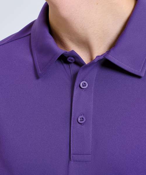 Wicking fabric. Polo shirt. Short sleeve. Mesh panels on sides excluding Melange colouways. 3-button placket. Self-fabric collar. We recommend using block out vinyl and inks. UPF 40+.