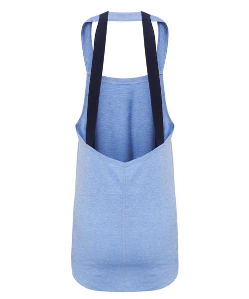 Soft touch fabric. Contrast double strap on back. Open back. Slight hi-lo hem. Twin needle stitch on hem, neck and arm holes. Slight stretch. We recommend using block out vinyl and inks.