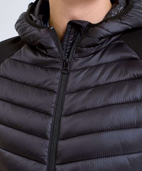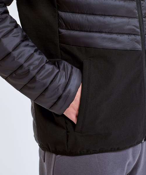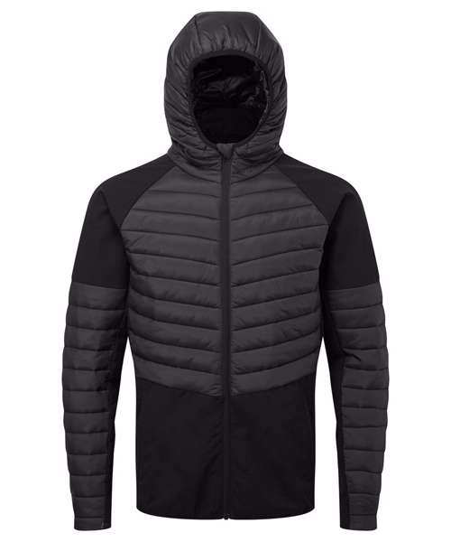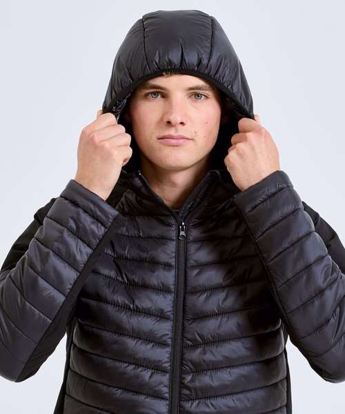 Hybrid jacket with diagonal quilted upper chest and full back. Lower jacket is shell fabric. Full zip-through style with panelled hood. Hood is elasticated for a snug fit. Front pockets. Elasticated hem. Quilted detailing to arms with lower arm in shell fabric. Internal storm flap with zip guard. We recommend using block out vinyl and inks.