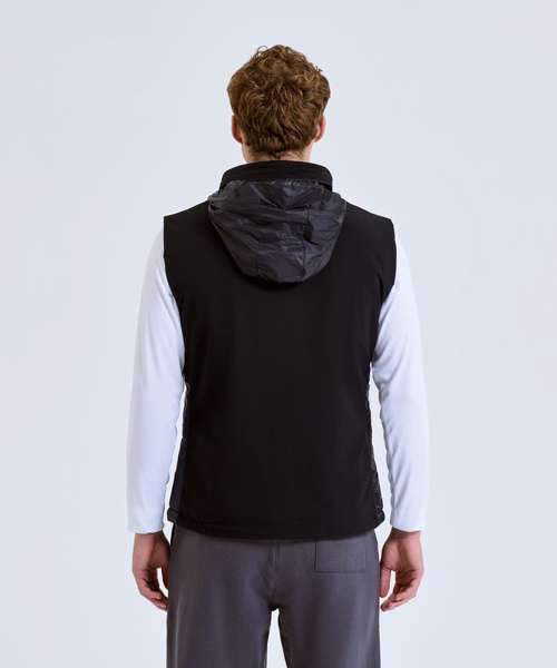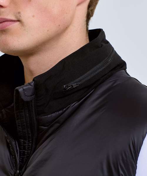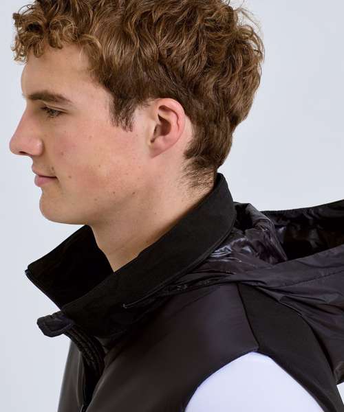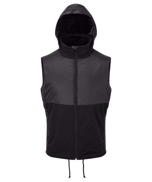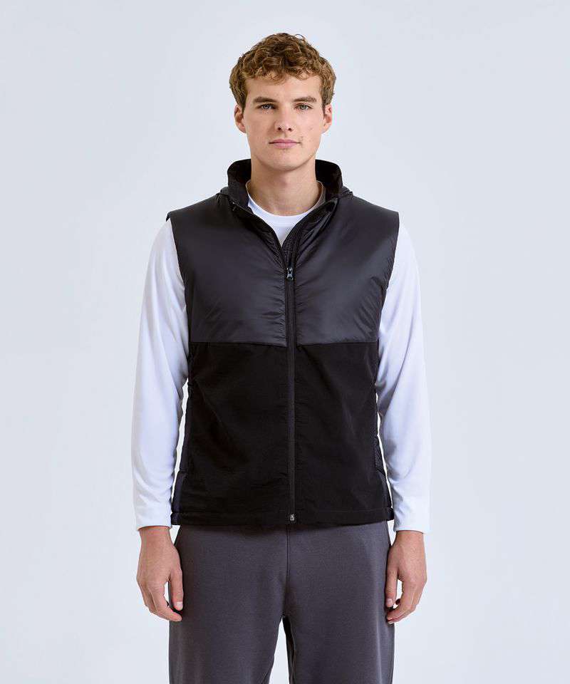 Hybrid gilet with padded panel upper chest and side seams. Lower jacket is shell fabric. Full zip-through style with collar. Drawcord inner hem. Zip side pockets. Concealed packable hood with adjustable cord and toggle to the back for to create a snug fit. Zip embroidery access to back panel and left chest. Inner pocket to left chest. Internal storm flap with zip guard. Packable bag included for handy storage of gilet when not in use. We recommend using block out vinyl and inks.