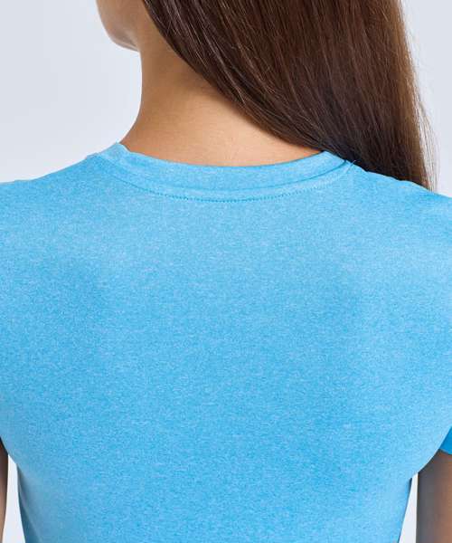 Wicking fabric. Stretch. Crew neck. Short sleeve. Lightweight. Twin-needle stitching on hem and arms. Recycled polyester. We recommend using block out vinyl and inks. UPF 40+.