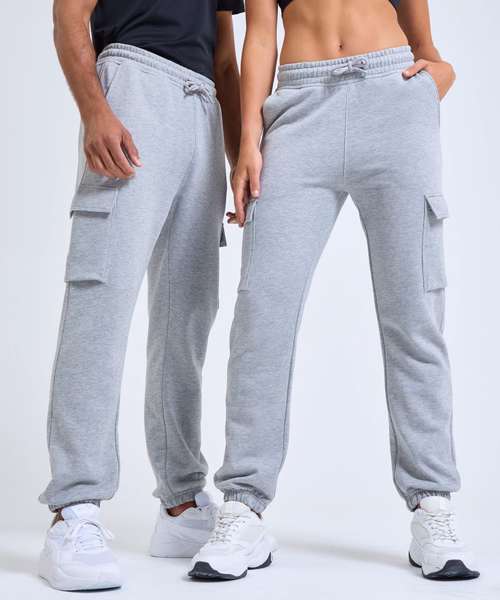 Soft feel. Inner brushed fleece. Recycled Polyester. Two front pockets. Cargo style pocket to either leg. Elasticated waistband and cuffs. Buttonhole stitched eyelets. Cords with painted metal ends. Unisex fit. We recommend using block out vinyl and inks.