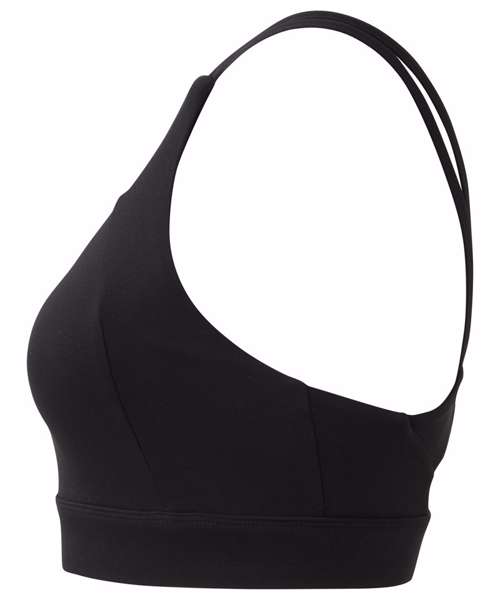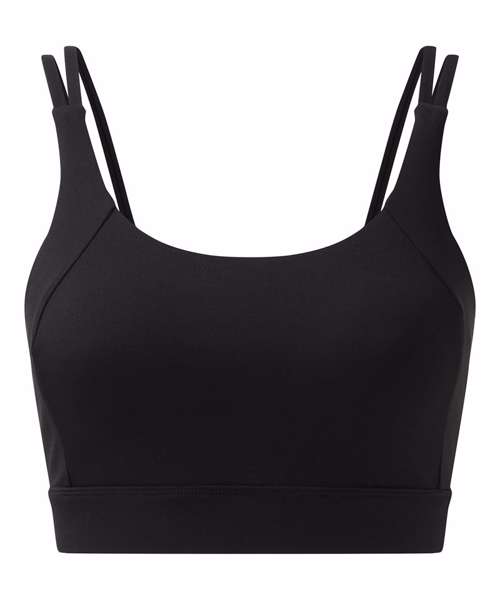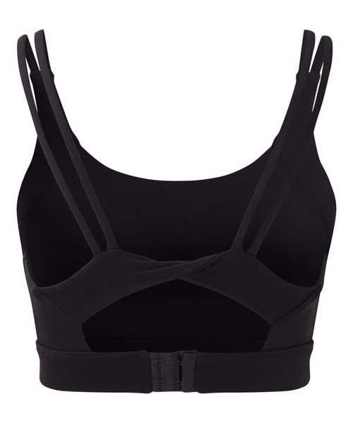 Medium-impact sports bra. Elasticated under bust for added support. Panel detailing to front and back of bra. Removable padding inner. Double strap detailing to both sides of bra. Twist-back detailing that sits above a hook and eye fastening. We recommend using block out vinyl and inks.