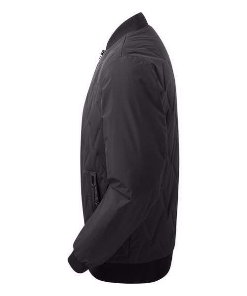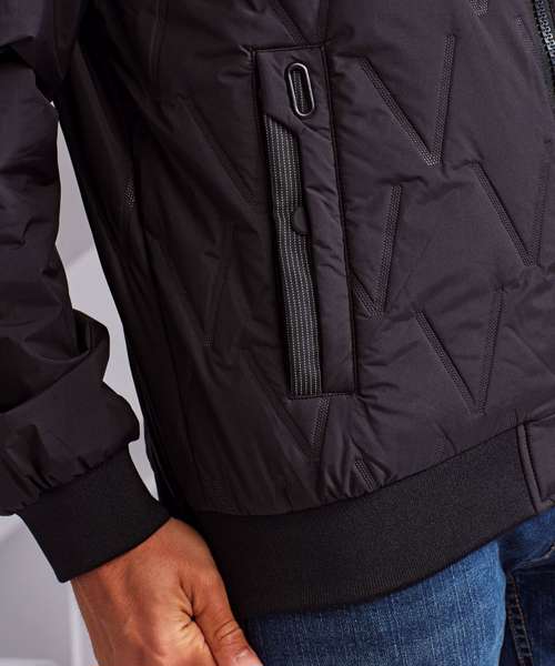 Tonal fashion coil zip on centre front with signature zip puller. Front & Back panels to be insulated with moulded vector shaped pattern. Insulated plain sleeves. 100gsm lightweight polyester fill. Fully-lined in tonal polyester. Bomber style collar. Welt pockets with rubberised stud opening, striped grosgrain trim with rectangular eyelet. Tonal elasticated cuffs and hem. Internal double jet zipped pocket. Internal zipped opening for embroidery access. Product contains no branded neck label.* Removable Kimble or looped garment tags. Inner seam label holds important product information on one label with a second label containing brand information which can be cut-away.