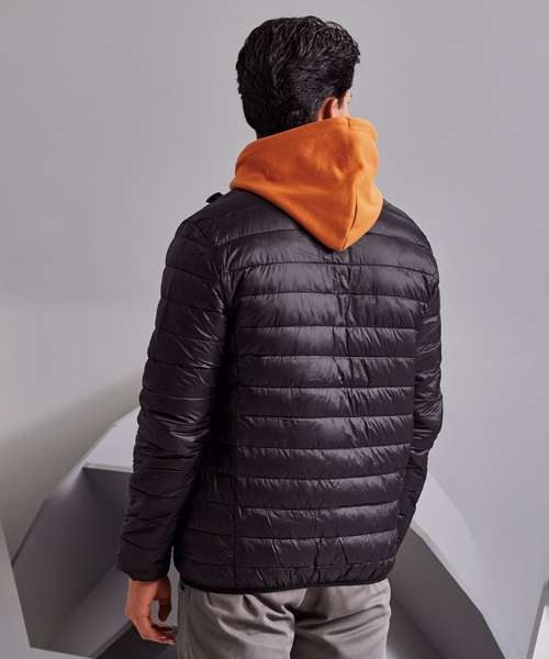 Tonal reverse coil zip on centre front with signature zip puller and internal storm flap with chin guard. Horizontal stitched sandwiched narrow baffles. Tonal reverse coil zip pockets with upper zip garages. Stretch binding on cuffs and hem for added protection. Side seam shaped panelling. Packable bag. Internal signature back neck hanger loop. 250gsm lightweight. polyester fill. Inside binding around seams. Product contains no branded neck label.* Removable Kimble or looped garment tags. Inner seam label holds important product information on one label with a second label containing brand information which can be cut-away.