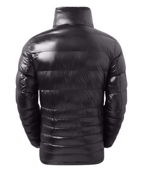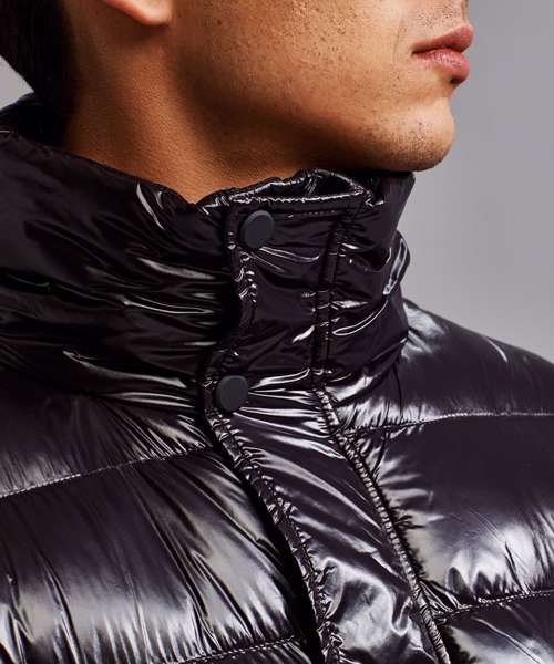 Wide external central storm flap with concealed coil zip, signature zip puller and internal storm flap with chin guard. Chunky rubberised stud fastenings on centre front. Horizontal stitched graded baffles. 245gsm polyester fill. Fully-lined in polyester matt finish. Self elasticated cuffs. Tonal coil zipped pockets with upper zip guard and self fabric piping around edges with rubberised edge trim. Glossy high shine face fabric. Internal double jet chest zipped reverse coil pocket. Product contains no branded neck label.* Removable Kimble or looped garment tags. Inner seam label holds important product information on one label with a second label containing brand information which can be cut-away.